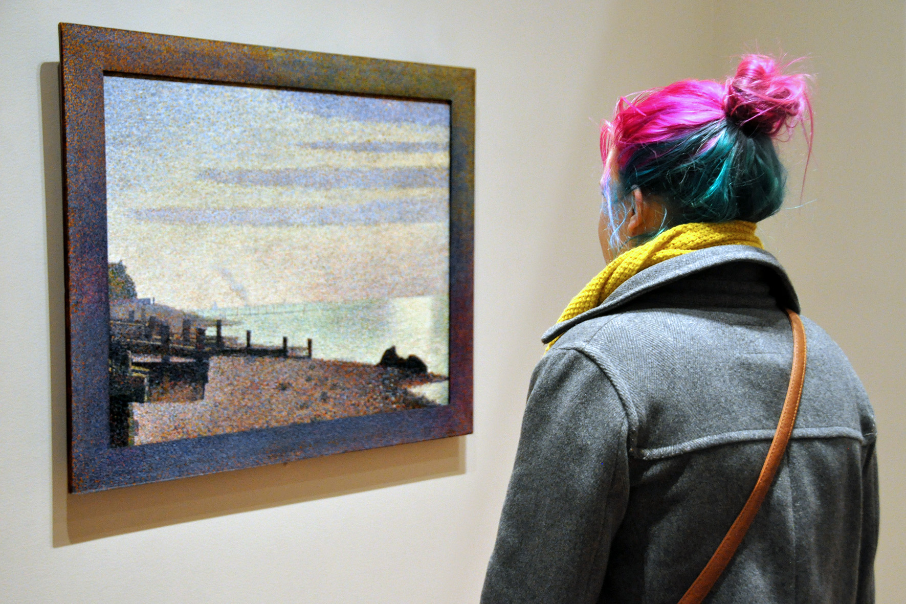 Dans un musée d’art moderne et contemporain, une personne regarde un tableau. Mais ce n’est pas tout à fait n’importe qui. C’est souvent une personne remarquable par ses choix vestimentaires, parfois par son attitude. Que le photographe demande à la personne de poser ou qu’il l’a saisisse à son insu, à chaque fois un dialogue s’instaure avec le tableau regardé. Parfois la présence de la personne éclaire ou au contraire contredit le tableau, mais toujours elle propose une lecture.